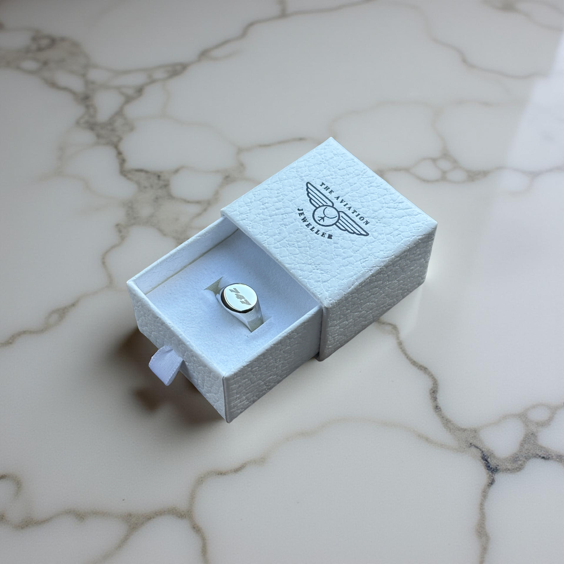 The 747 Runway Ring, a laser engraved sentimental piece of jewelry. Serving as a tribute to the history of the Boeing 747. It's a unique accessory that tells a story of travel, dedication, and transformation.